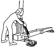 Монтажник М3 принимает захват, поданный машинистом крана, и стропит колонну, продевая стальной штырь через отверстия в оголовке колонны и щеках захвата. Убедившись в надежности строповки, монтажник отходит на безопасное расстояние. По его команде машинист крана плавно поднимает колонну и подает ее к