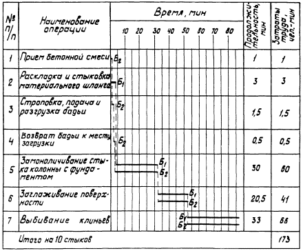 Бетонщики Б1 и Б2, заполнив стыки бетонной смесью и уплотнив ее штыкованием, терками заглаживают бетон на поверхности стыка. Затем, по достижении бетоном в стыке 50 % проектной прочности, бетонщики с помощью кувалд и ломов выбивают клинья, а отверстия заделывают бетонной смесью или раствором