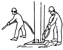 Бетонщик Б1 направляет сопло форсунки в зазоры между гранями колонны и стенками стакана фундамента и заполняет их бетонной смесью. Бетонщик Б2 подает сигналы машинисту установки на включение и выключение насоса, а также при необходимости переносит материальный шланг
