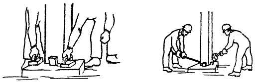 ЗАГЛАЖИВАНИЕ ПОВЕРХНОСТИ СТЫКА; ВЫБИВАНИЕ КЛИНЬЕВ; 53,5 мин; Б1, Б2; деревянные терки, ломы, кувалды