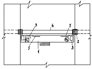 Монтажники М1 и М2, оперируя двумя упорными винтами кондукторов, рихтуют ригель в проектное положение по осевым рискам на колоннах и ригеле