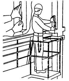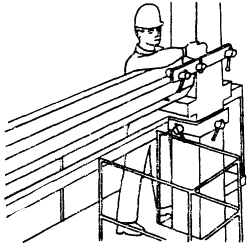 Монтажники М1 и М2, стоя на площадке группового кондуктора, молотками-зубилами очищают опорную часть консолей колонн от наплывов бетона. Затем при помощи метра и грифеля они наносят осевые риски на боковые грани колонн. После чего они принимают ригель на расстоянии 30 см от опорных консолей колонн и ориентируют его над местом укладки. По сигналу монтажника М1 машинист крана медленно опускает ригель, а монтажники направляют его так, чтобы риски на торцах ригеля и колонн совместились