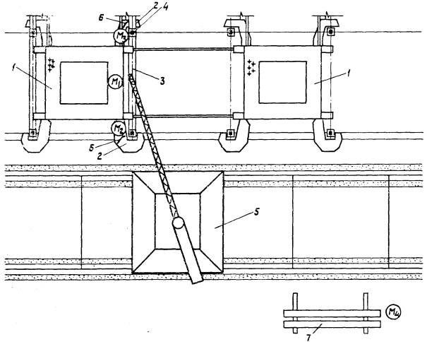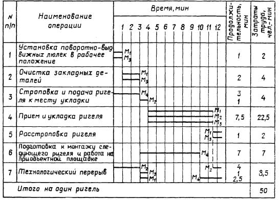 1 - рамно-шарнирные индикаторы; 2 - поворотно-выдвижные люльки; 3 - монтируемый ригель; 4 - кондуктор; 5 - кран; 6 - монтажные ломы; 7 - место складирования ригелей 4.3. График трудового процесса