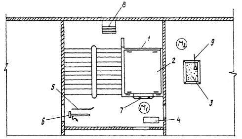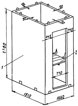 1 - блок шахты лифта; 2 - защитная крышка проема шахты лифта; 3 - ящик с раствором; 4 - ящик с инструментами; 5 - лом; 6 - рейка-отвес; 7 - ограждение дверного проема; 8 - столик-стремянка; 9 - лопата