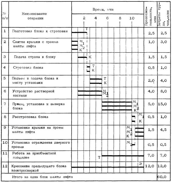 СНЯТИЕ КРЫШКИ С ПРОЕМА ШАХТЫ ЛИФТА; ПОДАЧА СТРОПА; М1, М2 - 1 мин; К - 2,5 мин; строп