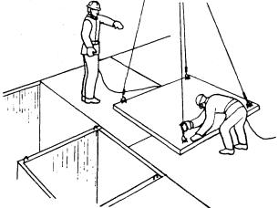 Монтажники М1 и М2 стропят крышку монтажного проема шахты лифта. Машинист крана К по команде монтажника М1 поднимает, а затем переносит и опускает крышку на перекрытие. Монтажники М1 и М2 расстроповывают крышку, и монтажник М1 дает машинисту крана сигнал о подаче стропа к блоку