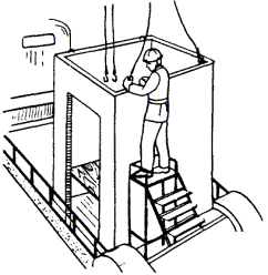 Монтажник М2 стропит крышку и дает машинисту крана сигнал подать ее к установленному блоку. Монтажник М1, стоя на столике-стремянке, принимает и