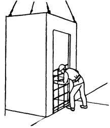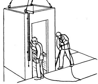4.1. Операции по монтажу блоков шахт лифтов выполняют в следующем порядке: подготовляют блок шахты к строповке; снимают крышку проема шахты лифта; подают строп к блоку и стропят его; устраивают растворную постель; поднимают и подают блок к месту монтажа; принимают, устанавливают, выверяют и расстроповывают блок; устанавливают крышку проема шахты лифта; устанавливают ограждение дверного проема; крепят блок электросваркой закладных деталей.