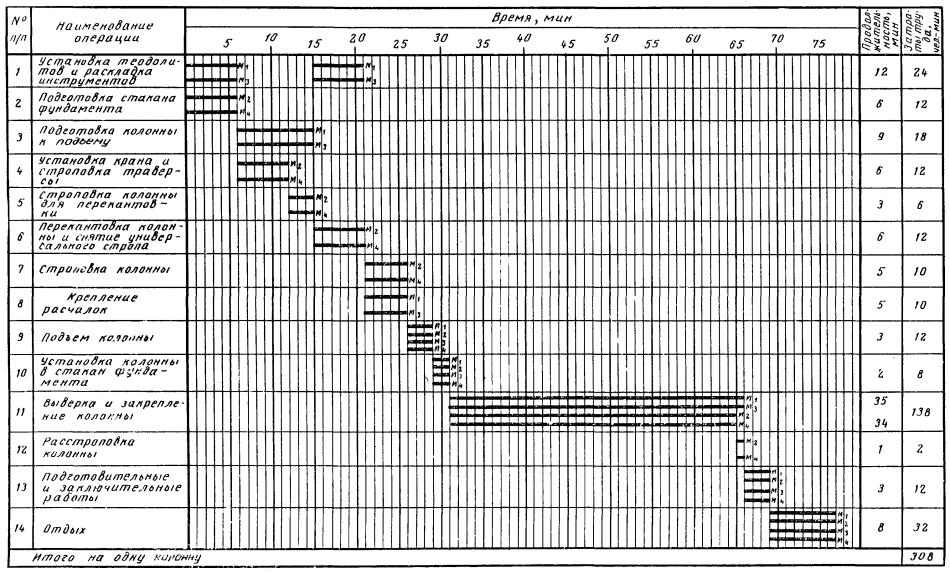ВЫВЕРКА И ЗАКРЕПЛЕНИЕ КОЛОННЫ; М1, М3 - 35 мин; М2, М4 - 34 мин; ломы, инвентарные винтовые клинья, теодолиты, нивелир
