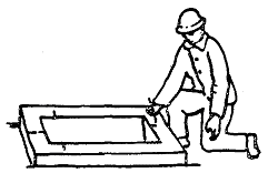 Монтажник М2 метром обмеряет башмак фундамента, проверяет наличие осевых рисок и при необходимости наносит их. Монтажник М4 лопатой очищает стакан фундамента от грязи и промывает его водой
