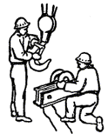 Монтажник М4 берет обеими руками универсальный строп и протягивает его под колонной в середине второй от консоли диафрагмы. Монтажник М2 принимает строп, подтягивает его и устанавливает на грани колонны инвентарные
