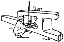 место стоянки крана и фиксируют его деревянным колышком. Машинист устанавливает кран на отмеченное место и по сигналу монтажника М2 опускает крюк к траверсе. Монтажник М4 устанавливает серьгу траверсы в положение, удобное для заводки крюка, а монтажник М2, придерживая предохранительную скобу, цепляет за нее