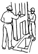 Монтажники М1, М2, М3 и М4 временно закрепляют колонну инвентарными винтовыми клиньями, вставляя их в зазоры между колонной и стенкой