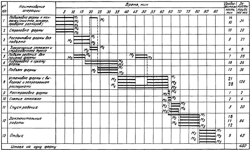 УСТАНОВКА ФЕРМЫ С ВЫВЕРКОЙ И ЗАКРЕПЛЕНИЕМ РАСПОРКАМИ; М1, М4, М5 - 28 мин; М2, М3 - 21 мин; расчалки, распорки, гаечные ключи