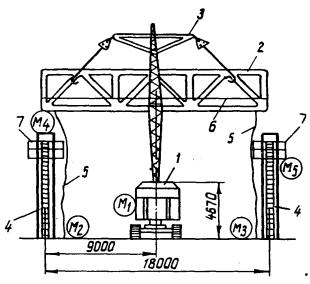 1 - кран на гусеничном ходу; 2 - железобетонная ферма; 3 - траверса; 4 - колонны; 5 - оттяжки; 6 - трос страховочный; 7 - монтажные лестницы с площадками