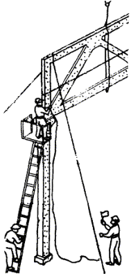 Монтажники М4 и М5 приставляют к колоннам лестницы и поднимаются по ним на площадки. Машинист крана поднимает ферму и направляет ее к месту установки. Монтажники М2 и М3