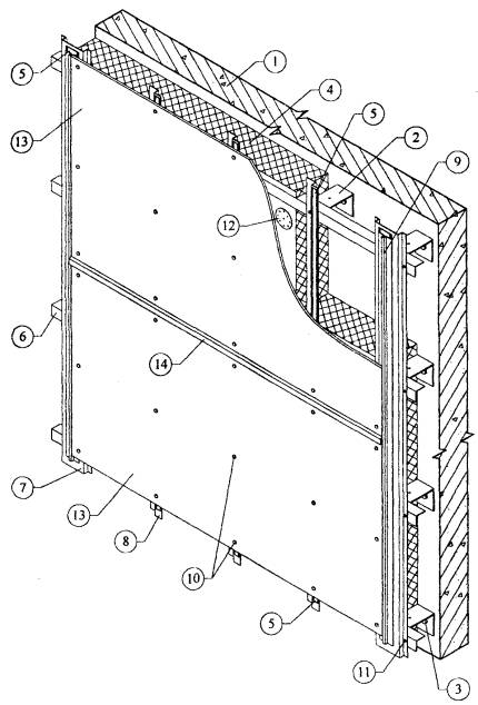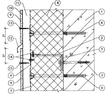1. Существующая стена. 2. Кронштейн. 3. Анкерный дюбель. 4. L-образный горизонтальный профиль. 5. П-образный вертикальный профиль. 6. Тарельчатый дюбель для крепления утеплителя. 7. Паронитовая прокладка. 8. Минераловатный утеплитель. 9. Плиты облицовочные. 10. Лента EPDM. 11. Воздушная прослойка. 12. Планка вертикального шва. 13. Самонарезающий винт для плит. 14. Самонарезающий оцинкованный винт для каркаса. Рис. 3.9. Горизонтальный разрез системы по вертикальному шву.
