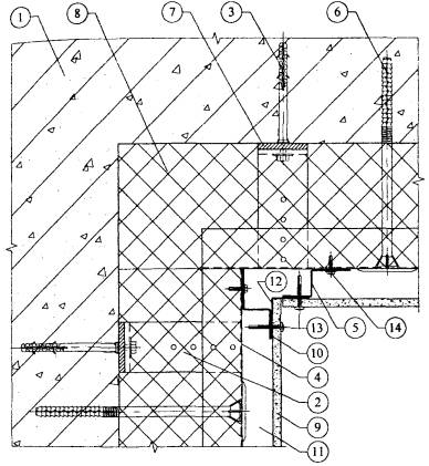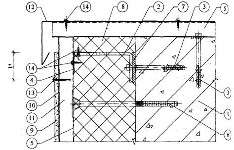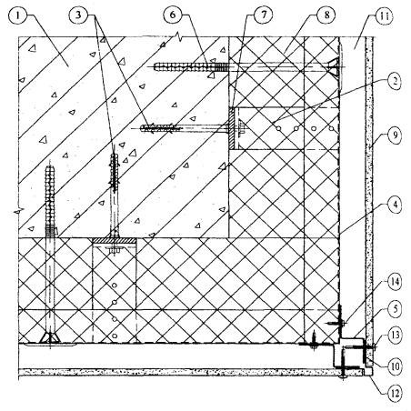 1. Существующая стена. 2. Кронштейн. 3. Анкерный дюбель. 4. L-образный горизонтальный профиль. 5. Z-образный вертикальный профиль. 6. Тарельчатый дюбель для крепления утеплителя. 7. Паронитовая прокладка. 8. Минераловатный утеплитель. 9. Плиты облицовочные. 10. Лента EPDM. 11. Воздушная прослойка. 12. Планка вертикального шва. 13. Самонарезающий винт для плит. 14. Самонарезающий оцинкованный винт для каркаса. Рис. 3.7. Горизонтальный разрез системы по внутреннему углу.