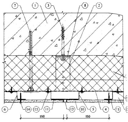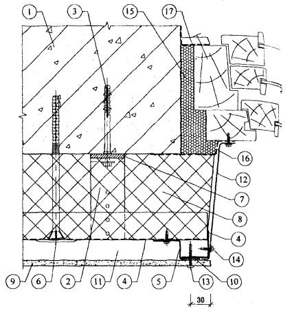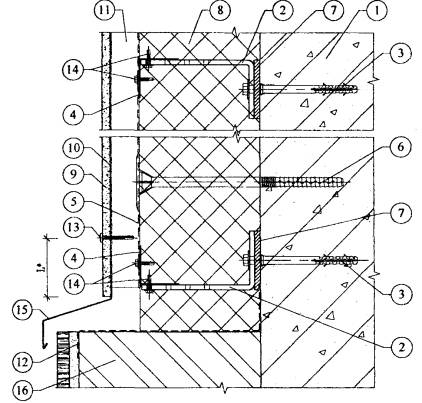 1. Существующая стена. 2. Кронштейн. 3. Анкерный дюбель. 4. L-образный горизонтальный профиль. 5. П-образный вертикальный профиль. 6. Z-образный вертикальный профиль. 7. Тарельчатый дюбель для крепления утеплителя. 8. Паронитовая прокладка. 9. Минераловатный утеплитель. 10. Плиты облицовочные. 11. Лента EPDM. 12. Воздушная прослойка. 13. Планка вертикального шва. 14. Самонарезающий винт для плит. 15. Самонарезающий оцинкованный винт для каркаса. Рис. 3.20. Горизонтальный разрез системы по вертикальному стыку панелей (вариант). 4. Исходные данные для проектирования системы4.1. Проектно-сметная документация на систему для конкретного объекта разрабатывается на основе задания на проектирование, подготовленного в соответствии с существующим в г. Москве порядком и утвержденного заказчиком. Задание на проектирование обязательно должно содержать требование о соответствии системы СНиП II-3-79* (изд. 98 г.), СНиП 23-02-2003 и МГСН 2.01-99. 4.2. Задание на проектирование должно включать следующие исходные данные: - архитектурные чертежи фасадов здания, включающие данные о фактуре и цвете облицовочных материалов, чертежи архитектурных деталей (карнизов, обрамления проемов и т.п.) и другие необходимые данные, если это не входит в состав работ по данному заданию; - строительные чертежи наружных стен от фундаментов до парапетов, включая узлы, поясняющие решение и размеры всех конструкций; - данные от разработчиков фундаментов о величине допустимой дополнительной нагрузки на стены здания или заключение компетентной организации о несущей способности фундаментов здания; - план участка, где расположено здание. Для реконструируемых зданий задание на проектирование дополнительно должно содержать акт обследования наружных стен здания, где указывается состояние поверхности фасадов, результаты испытаний на усилия, с которым принятые дюбели можно вырвать из стены и геодезическую съемку поверхностей фасадов с данными о величине отклонений их отдельных участков от вертикальной плоскости. 4.3. В составе задания на проектирование должно быть Приложение к Техническому свидетельству Госстроя России на эту фасадную систему. 5. Определение основных параметров системы5.1. К основным параметрам системы следует отнести: - тип и размер облицовочных материалов и способ их крепления к несущему каркасу; - характеристику принятых плит утеплителя: марку, размеры, плотность, теплопроводность, наличие или отсутствие защитного слоя; - величину воздушного зазора; - схему размещения на фасаде здания кронштейнов, горизонтальных и вертикальных профилей со всеми необходимыми размерами, в том числе, расстояние от основания до экрана; - марку дюбелей для крепления кронштейнов несущего каркаса к основанию; - марку дюбелей для крепления плит утеплителя к основанию. 5.2. Тип и размер облицовочных плит, их цвет и фактуру поверхности определяет главный архитектор проекта, если эти данные не приведены в задании на проектирование системы. 5.3. Выбор плит утеплителя выполняется на основании теплотехнических расчетов, методика которых приводится ниже. Там же (в разделе «Теплотехнические расчеты») приводится методика определения величины воздушного зазора В случае применения плит утеплителя с кашированной поверхностью можно обойтись без гидроветрозащитной мембраны. 5.4. Схема размещения на фасаде здания элем
