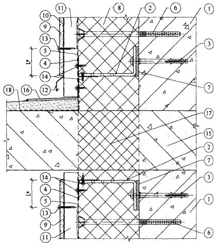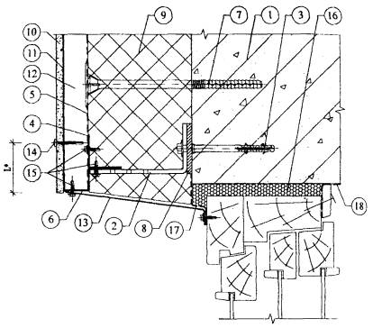 *) - L см. п. 3.5.2 1. Существующая стена. 2. Кронштейн. 3. Анкерный дюбель. 4. L-образный горизонтальный профиль. 5. П-образный вертикальный профиль. 6. Тарельчатый дюбель для крепления утеплителя. 7. Паронитовая прокладка. 8. Минераловатный утеплитель. 9. Плиты облицовочные. 10. Лента EPDM. 11. Воздушная прослойка. 12. Планка горизонтального шва. 13. Самонарезающий винт для плит. 14. Самонарезающий оцинкованный винт для каркаса. 15. Плита балкона (козырька). 16. Оцинкованная сталь δ = 0,7 мм. 17. Термовкладыш. 18. Гидроизоляция. Рис. 3.12. Вертикальный разрез примыкания системы к балкону (козырьку).
