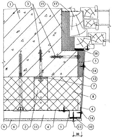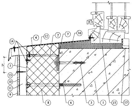 1. Существующая стена. 2. Кронштейн. 3. Анкерный дюбель. 4. L-образный горизонтальный профиль. 5. Z-образный вертикальный профиль. 6. Тарельчатый дюбель для крепления утеплителя. 7. Паронитовая прокладка. 8. Минераловатный утеплитель. 9. Плиты облицовочные. 10. Лента EPDM. 11. Воздушная прослойка. 12. Оцинкованная сталь δ = 0,7 мм. 13. Самонарезающий винт для плит. 14. Самонарезающий оцинкованный винт для каркаса. 15. Пенный утеплитель. 16. Водоизоляционная паропроницаемая лента. 17. Пароизоляционная лента. Рис. 3.18. Горизонтальный разрез системы по оконному откосу (вариант).
