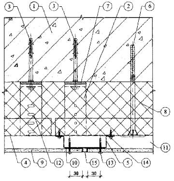 1. Существующая стена. 2. Кронштейн. 3. Анкерный дюбель. 4. L-образный горизонтальный профиль. 5. П-образный вертикальный профиль. 6. Тарельчатый дюбель для крепления утеплителя. 7. Паронитовая прокладка. 8. Минераловатный утеплитель. 9. Плиты облицовочные. 10. Лента EPDM. 11. Воздушная прослойка. 12. Парный кронштейн с овальным отверстием. 13. Самонарезающий винт для плит. 14. Самонарезающий оцинкованный винт для каркаса. 15. Планка вертикального шва. Рис. 3.19. Горизонтальный разрез системы по вертикальному шву над окном.