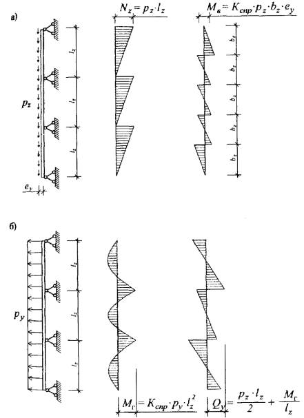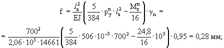 прочность на сдвиг обеспечивается. Проверка прочности крепления к горизонтальной направляющей Крепление производится двумя стальными самонарезающими винтами (ns = 2) диаметром d = 4 мм, do = 3 мм, с расчетной площадью сечения одного самореза An = 7 мм2, с расчетными сопротивлениями по п. 6.2. Усилия, действующие на соединение. Nz,2 = γm · Nz = 1,2 · 71 = 85 Н; Ny,2 = γm · py · lz = 1,2 · 708 · 0,7 = 595 Н. По формулам (127) - (129) [6]: на срез Nz,2 · γn = 85 · 0,95 = 81 Н < Rbs · γb · An · ns = 150 · 0,8 · 7 · 2 = 1680 Н; на растяжение Ny,2 · γn = 595 · 0,95 = 565 Н < Rbt · An · ns = 170 · 7 · 2 = 2380 Н; на смятие профиля под саморезом Nz,2 · γn = 81 Н < Rbp · γb · do · δ · ns = 155 · 0,8 · 3 · 1,2 · 2 = 893 Н; прочность соединения на срез, растяжение и смятие обеспечивается. Проверка жесткости Проверяется прогиб в направлении оси «у», т.е. по нормали к стене, от действия нормативной ветровой нагрузки pyn = 506 Н/м, с изгибающим моментом на средней опоре Myn = 24,8 Нм. По известной формуле [24]