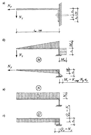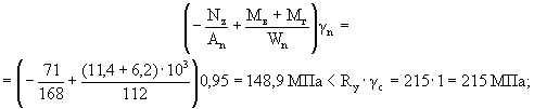 прочность стенки на сдвиг обеспечивается. В горизонтальной полке поперечная сила значительно меньше, поэтому ее прочность на сдвиг также обеспечивается, расчет не повторяется. Проверка прочности крепления к кронштейну Крепление производится двумя стальными самонарезающими винтами (ns = 2) диаметром d = 4 мм, do = 3 мм, с расчетной площадью сечения одного самореза An = 7 мм2, с расчетными сопротивлениями по п. 6.2. На соединение действует только горизонтальное усилие от ветровой нагрузки: Ny,2 = γm · Ny = 1,2 · 496 = 595 Н. По формулам (127) - (129) [6]: на срез Ny,2 · γn = 595 · 0,95 = 565 Н < Rbs · γb · An · ns = 150 · 0,8 · 7 · 2 = 1680 Н; на смятие профиля под саморезами Ny,2 · γn = 565 Н < Rlp · γb · do · δs · ns = 155 · 0,8 · 3 · 1,2 · 2 = 893 Н; прочность соединения на срез и смятие обеспечивается. 6.4.6. Расчет кронштейна Геометрические характеристики Параметры поперечных сечений: сплошного сечения: δ = 4 мм; b = 50 мм; ослабленных отверстиями: полки bn = 50 - 2 · 5 = 40 мм; An = bn · δ = 40 · 4 = 160 мм2; стенки bn = 50 - 8 = 42 мм; An = 42 · 4 = 168 мм2; Wxn = 42 · 42/16 = 112 мм3; Jxn = 42 · 43/12 = 224 мм4; Sxn = 42 · 42/8 = 84 мм3; tn = bn = 42 мм. Усилия От расчетной вертикальной нагрузки Nz = pz · lz = 101 · 0,7 = 71 Н; то же от горизонтальной Ny = py · lz = 708 · 0,7 = 496 Н. Изгибающие моменты в ослабленном сечении стенки (Нм): Mв = Nz · lкр = 71 · 160 · 10-3 = 11,4; Мг = Kспр. · Ny · ez = 0,5 · 496 · 25 · 10-3 = 6,2. Проверка прочности на сжатие и растяжение с изгибом В наиболее невыгодных условиях находится сечение стенки под болтом. По формуле (50) [6] на сжатие с изгибом