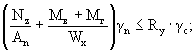 f/lx = 0,97/600 = 1/619 < [f/l] = 1/200, жесткость облицовки достаточна. 6.4.4. Расчет вертикального направляющего профиля Геометрические характеристики Для поперечного сечения: A = 216 мм2; An = 204 мм2; Jx = 14661 мм4; Wx = 1086 мм3; Sx = 754 мм3; t = 2δ = 2 · 1,2 = 2,4 мм. Усилия Нагрузки на 1 м профиля (Н/м). - вертикальные от плит: нормативная pzn = qzn · lx = 140 · 0,6 = 84; расчетная pz = qz · lx = 168 · 0,6 = 101; эксцентриситет eyc = 11 мм; - горизонтальные от ветра: нормативная pyn = qyn · lx = 843 · 0,6 = 506; расчетная py = qy · lx = 1180 · 0,6 = 708. Изгибающие моменты в плоскости, перпендикулярной стене (Нм): - от вертикальной нагрузки: нормативной Mвn = Kспр. · pzn · lz · ey = 0,5 · 84 · 0,7 · 0,011 = 0,3; расчетной Mв = Kспр. · pz · lz · ey = 0,5 · 101 · 0,7 · 0,011 = 0,4; - от ветровой нагрузки: нормативной Mгn = Kспр. · pyn · lz2 = 0,1 · 506 · 0,72 = 24,8; расчетной Mг = Kспр. · py · lz2 = 0,1 · 708 · 0,72 = 34,7. Продольное усилие Nz = pz · lz = 101 · 0,7 = 71 Н. Поперечная сила Qy = py · lz/2 + Mг/lz = 708 · 0,7/2 + 34,7/0,7 = 297 Н. Проверка прочности на растяжение с изгибом По формуле (50) [6] для сечения над средней опорой при наиболее невыгодном сочетании усилий (с максимальной величиной момента Mг)