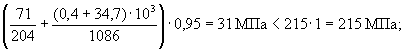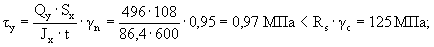 прочность стенки на сжатие с изгибом обеспечивается; сечения полки подвергаются растяжению силой Ny и изгибу от моментов Mв и Mг, но так как моменты вычитаются (см. рис 6.4), то суммарные напряжения в полке значительно уменьшаются; прочность полки на растяжение с изгибом обеспечивается, расчет не повторяется. Проверка прочности на сдвиг Наиболее напряжено, как и при изгибе, сечение стенки под болтом; усилие сдвига Qy = Ny = 496 Н. по формуле (29) [6]