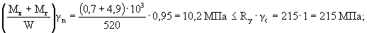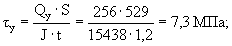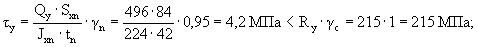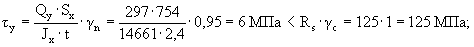 прочность профиля на изгиб обеспечивается. Вертикальной полки (стенки) по формуле (28) [6] на изгиб в плоскости YOZ: Mг,ст · γn/Wx = 9,9 · 103 · 0,95/144 = 65,3 МПа < Ry · γc = 215 МПа; прочность стенки на изгиб обеспечивается. Горизонтальной полки по формуле (5) [6] на растяжение в направлении оси «Y»: Ny · γn/An = 496 · 0,95/714 = 0,66 МПа < Ry · γc = 215 МПа; прочность полки на растяжение обеспечивается. Проверка прочности на сдвиг Поперечного сечения в двух плоскостях: по формуле (29) [6]