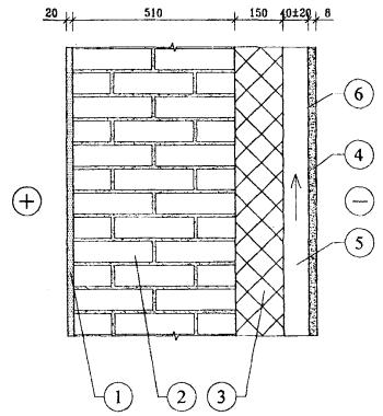где: 4,25; 2,1; 4,9 - коэффициенты излучения, Ккал/м2 · ч · °К4; 0,61 - температурный коэффициент; 0,045 - коэффициент теплопроводности минваты для условий эксплуатации «Б» в соответствии с сертификатами. 1 - штукатурный раствор; 2 - кирпичная кладка; 3 - минеральная вата; 4 - панель экрана; 5 - воздушная прослойка; 6 - зона возможной конденсации. Рис. 7.1. Схема наружной стены для расчета влажностного режима. Сопротивление теплопередаче по глади наружной стены при толщине утеплителя из минваты 0,15 м: