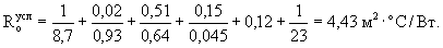 *) В запас теплозащиты не приводится термическое сопротивление штукатурки. где: 3,13 - требуемое сопротивление теплопередаче стен для г. Москвы 0,726 - коэффициент теплотехнической однородности, см. табл. 2 (при проемности 25 %); 0,12 - термическое сопротивление вентилируемой воздушной прослойки. Rвп = 1/αвп = 1/6,8 = 0,15 м2 · °С · ч/Ккал (0,12 м2 · °С/Вт), где: αвп - коэффициент теплообмена по формуле (15); αвп = 5,5 + 5,7Vпр + αл = 5,5 + 5,7 · 0,1 + 0,66 = 6,8 Ккал/м2 · ч · °С (7,8 Вт/м2 · °С);