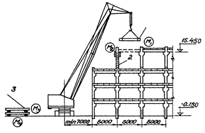 1 - монтируемый ригель; 2 - приставная лестница; 3 - складированные ригели 4.3. График трудового процесса