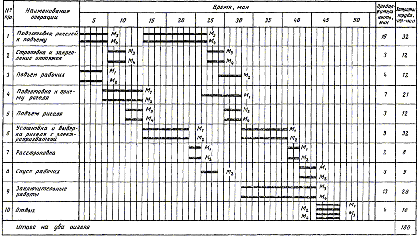 2. УСЛОВИЯ И ПОДГОТОВКА ВЫПОЛНЕНИЯ ПРОЦЕССА2.1. Ригели укладывают на выверенные и закрепленные колонны после того, как бетон в стыках колонн и фундаментов достигнет 70 % проектной прочности. Смещение осей ригелей относительно разбивочных осей на колоннах не должно превышать ± 5 мм; а отклонение высотных отметок опорных узлов ригелей ± 20 мм. 2.2. Работы следует выполнять, строго соблюдая правила техники безопасности и охраны труда рабочих согласно СНиП III-А.11-70, § 14. 3. ИСПОЛНИТЕЛИ, ПРЕДМЕТЫ И ОРУДИЯ ТРУДА3.1. Исполнители: монтажник конструкций V разряда (М1) - 1 монтажник конструкций IV разряда (М2) - 1 монтажники конструкций III разряда (М3, М4) - 2 3.2. Инструменты, приспособления и инвентарь