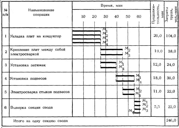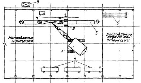 1 - монтажный кран; 2 - строп четырехветвевой; 3 - кондуктор; 4 - плиты ПКЖ; 5 - стеллаж с заготовками затяжек и подвесов; 6 - шкаф для хранения накладных деталей, шайб и гаек; 7 - ящик для инструментов; 8 - сварочный пост 4.4. График трудового процесса