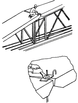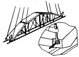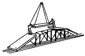 *) г. Челябинск, проспект Ленина, 89. **) Москва, Г-19, ул. Маркса и Энгельса, 7/10. 4. ТЕХНОЛОГИЯ ПРОЦЕССА И ОРГАНИЗАЦИЯ ТРУДА4.1. Секции полигональных сводов собирают на специальном кондукторе. 4.2. Операции по сборке секций полигональных сводов выполняют в следующем порядке: укладывают сначала опорные, а затем промежуточные плиты на кондуктор, одновременно раскладывая затяжки и подвесы; соединяют уложенные на кондуктор плиты между собой при помощи стальных накладок, привариваемых к закладным деталям в углах плит; протягивают через отверстия в опорных частях плит затяжки диаметром 24 мм; соединяют затяжки в средней части свода электросваркой; устанавливают стальные подвесы диаметром 12 мм; окончательно натягивают затяжки. 4.3. Организация рабочего места