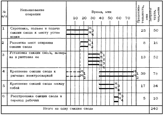 свода. По сигналу монтажника М1 машинист крана опускает секцию свода на место установки. Монтажники М3 и М4 поднимаются на покрытие и вместе с монтажниками