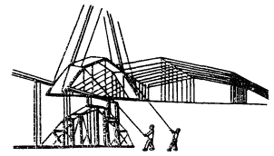 М1 и М2 производят выверку секции. При необходимости они рихтуют секцию свода ломами. Убедившись в том, что секция свода заняла проектное положение, монтажники М3 и М4 временно крепят ее в коньковой части к ранее смонтированной при помощи струбцины