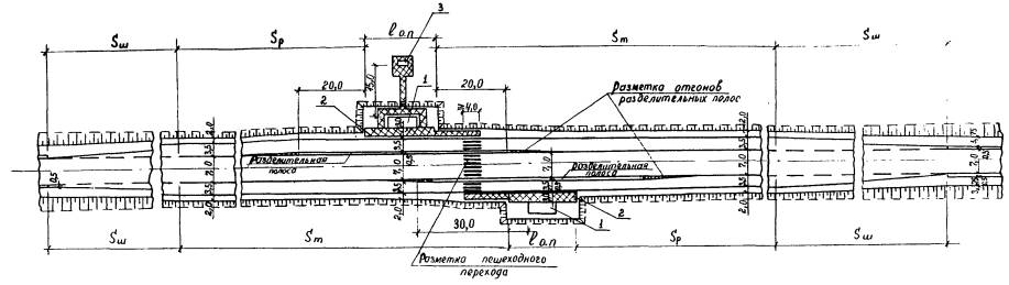 Рис. 2. Схема автобусных остановок на дорогах II - III категорий. Обозначения см. рис. 1 (ширины проезжей части, переходно-скоростных полос и разделительных полос указаны для дорог III категории)