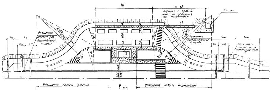 2.13. В зоне пересечений в разных уровнях автобусные остановки, как правило, не устраивают. Их рекомендуется располагать за пределами пересечения с обеспечением видимости при движении по криволинейным элементам пересечения, в местах съезда с автомобильных дорог и выезда на них и по возможности с обеспечением боковой видимости. При необходимости расположения автобусных остановок поблизости от путепровода их переходно-скоростные полосы проектируют в дополнение к полосам движения на пересечении. 2.14. В зонах железнодорожных переездов автобусные остановки следует располагать не ближе 250 м от переездов. 2.15. В отдельных случаях автобусные остановки по протяжению дороги целесообразно совмещать с площадками для остановок автомобилей, размещая последние за павильонами, в зависимости от местных условий. 2.16. Автобусные остановки не следует проектировать на участках дорог, где расчетный коэффициент безопасности с учетом влияния остановок будет меньше 0,7 или коэффициент аварийности больше 20. 2.17. Автобусные остановки не рекомендуется располагать: в пониженных зонах рельефа местности, где возможны снежные заносы, подтопления, туманы, гололед; на участках дорог с насыпями более 1,5 м. 3. Планировка автобусных остановок и их сопряжение с дорогами3.1. При проектировании автобусных остановок предусматривают остановочные площадки для автобусов, переходно-скоростные полосы для торможения и разгона, посадочные площадки, площадки ожидания (павильон для пассажиров), тротуары и переходные дорожки, туалеты, а также отдельные элементы по изоляции автобусных остановок от основных полос движения, организации автобусного и пешеходного движения, освещению, архитектурному оформлению (см. примеры решений - вклейка). 3.2. Длину остановочных площадок принимают в зависимости от количества автобусов, одновременно останавливающихся на данной остановке, но не менее: 10 м для одного автобуса, 25 м при одновременной остановке двух автобусов и 35 м при одновременной остановке трех автобусов. Ширину остановочных площадок следует принимать равной ширине основных полос проезжей части: 3,75 м на дорогах I - II категорий; 3,5 м на дорогах III категории и 3 м на дорогах IV - V категорий. 3.3. Переходно-скоростные полосы, примыкающие к остановочной площадке и предназначенные для торможения и разгона автобусов, проектируют в соответствии с категорией дороги. Длину переходно-скоростных полос принимают по табл. 2. Отгон полос торможения следует начинать с уступа в плане величиной 0,5 м для четкого выделения начала полосы торможения. 3.4. Ширину переходно-скоростных полос принимают равной ширине основных полос движения. При установке бордюров по кромке переходно-скоростных полос последние следует уширять на величину, равную двум возвышениям бордюра над проезжей частью - при расположении бордюра с одной стороны и на величину пяти возвышений - при двустороннем расположении. Допускается не выполнять это уширение на участках, где скорость движения автобусов менее 30 км/час: на полосах торможения на протяжении до 25 м и на полосах разгона на протяжении до 75 м от остановочных площадок. 3.5. Ровность и коэффициент покрытия переходно-скоростных полос и остановочных площадок должны быть не ниже, чем на основных полосах движения. Переходно-скоростные полосы рекомендуется выделять по возмож
