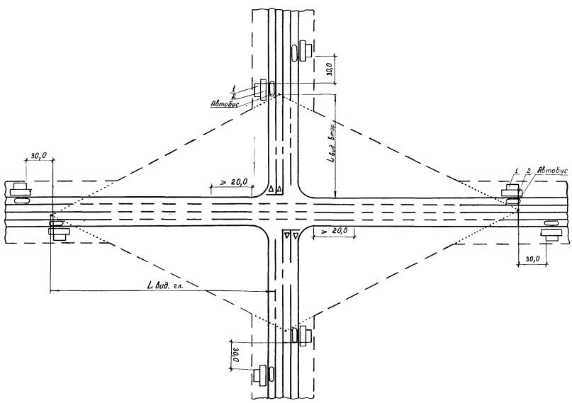 Рис. 5. Схема расположения автобусных остановок в зоне пересечений в одном уровне. |