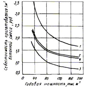 24. Рассматриваемая модель является общей. Из нее вытекают все частные случаи: 1) при m = 0 получаем статическую модель комбинированного размещения инвентарных баз и передвижных ЦБЗ; 2) p = 0, M = 0 получаем статическую модель размещения стационарных ЦБЗ; 3) m = 0, M = 0 получаем статическую модель размещения передвижных ЦБЗ. Исходная информация25. Для решения поставленной задачи требуются следующие исходные данные: длина трассы автомобильной дороги и темп ее строительства; обозначение объектов укладки бетонной смеси; пункты возможного размещения стационарных и передвижных ЦБЗ; расстояние между пунктами возможной дислокации стационарных и передвижных ЦБЗ; расстояние перевозки готовой смеси и ее компонентов автомобильным транспортом от пунктов размещения стационарных и передвижных предприятий до пунктов потребления с указанием категорий дорог; величины текущих и единовременных затрат на производство бетонных смесей; величины удельных затрат на перевозку готовой смеси и ее компонентов различными видами транспорта; величины удельных затрат на перебазирование стационарных и передвижных ЦБЗ. Применение экономико-математических методов с использованием ЭВМ будет эффективным только в том случае, если в расчетах используются достаточно точные исходные данные. 26. Расчет потребности в бетонной смеси следует производить по нормам расхода на 1 км покрытия строящейся автомобильной дороги с учетом ее типа и категории. При этом объектами потребления можно считать условно выбранные участки строящейся трассы. 27. Темп строительства (скорость строительного потока) определяет производительность ЦБЗ, а также срок строительства автомобильной дороги. 28. Стационарные ЦБЗ и базы для хранения материалов в первую очередь размещаются вблизи железнодорожных станций в районе строительства автомобильных дорог. При этом необходимо учитывать возможность устройства подъездного железнодорожного пути и расположения разгрузочного, бетоносмесительного и другого оборудования. 29. Стационарные ЦБЗ следует размещать прежде всего в тех местах, где имеются прирельсовые разгрузочные базы или намечается их строительство. 30. Для оценки возможности размещения ЦБЗ необходимо иметь данные о расположении цементных заводов и карьеров нерудных материалов, пригодных для приготовления высококачественных бетонных смесей, а также о наличии в районе завода рабочей силы, источников электро- и водоснабжения и т.д. Метод определения приведенных затрат на производство бетонных смесей в стационарных и передвижных ЦБЗ31. Себестоимость приготовления бетонной смеси по каждому типу предприятий складывается из различных статей расхода, основными из которых (без учета стоимости компонентов бетонной смеси) являются: затраты на эксплуатацию машин и оборудования, содержание зданий и сооружений; заработная плата обслуживающему персоналу; накладные расходы. 32. Зависимость себестоимости приготовления смеси для различных типов ЦБЗ (баз) имеет вид гиперболы (см. рис. 3) и выражается уравнением где а и b - постоянные коэффициенты; x - мощность предприятий по производству бетонной смеси, тыс. м3. Полученные по уравнению (7) математические зависимости себестоимости от мощности для различных типов ЦБЗ (при коэффициенте использования производственных мощностей равном 1) представле
