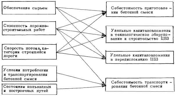 13. Размещение ЦБЗ в дорожном строительстве - процесс, определяемый большим числом взаимосвязанных факторов, экономическую оценку которых и степень их воздействия на приведенные затраты по приготовлению и транспортированию бетонной смеси можно произвести с помощью статистических и экономико-математических методов. Это облегчает решение задачи выбора типов ЦБЗ и их оптимального размещения при строительстве автомобильных дорог. В связи с этим необходимо учесть влияние перечисленных факторов в системе показателей затрат (критерий оптимальности), определяющих оптимальный выбор типов ЦБЗ и их размещение при строительстве автомобильных дорог. Постановка задачи и методика ее решения14. Использование передвижных предприятий связано с незначительными, по сравнению с передислокацией стационарных ЦБЗ, затратами, но вместе с тем применение их во многих случаях не исключает наличия прирельсовых базисных складов для хранения компонентов цементобетонной смеси. 15. Одним из основных вопросов организации производства цементобетонных смесей является целесообразность комбинированного использования стационарных и передвижных предприятий. Для конкретных условий эффективность применения только передвижных ЦБЗ, или их применение совместно с инвентарными базами хранения материалов по сравнению со стационарными предприятиями можно определить лишь технико-экономическими расчетами по специально разработанной методике. 16. В основу методики выбора типов ЦБЗ и их размещения положен комплексный метод изучения звеньев всего технологического процесса устройства покрытий (приготовление, транспортирование и выгрузка смесей) с обязательным рассмотрением возможности использования передвижных ЦБЗ. 17. При решении задачи рационального размещения ЦБЗ надо рассматривать различные варианты снабжения бетоном: только стационарными или только передвижными, или сочетанием стационарных и передвижных ЦБЗ. Необходимо также предусмотреть возможность перевозки смеси различными средствами автомобильного транспорта: автомобилями-самосвалами, бетоновозами, бетоносмесителями. 18. Целесообразность применения передвижных ЦБЗ по сравнению со стационарными необходимо в каждом конкретном случае рассматривать с учетом возможной передислокации не только передвижных, но и стационарных ЦБЗ. Пункты их размещения на весь планируемый период и частоту передислокации следует определять в соответствии с установленным критерием оптимальности, чтобы приведенные затраты на приготовление и перевозку бетонной смеси за весь период строительства были минимальными. 19. При ограниченном количестве возможных пунктов производства и укладки бетонных смесей экономическая эффективность Э применения стационарного или передвижного ЦБЗ, или того и другого, в соответствии с критерием оптимальности, определяется путем сопоставления приведенных суммарных затрат на единицу продукции следующими уравнениями: