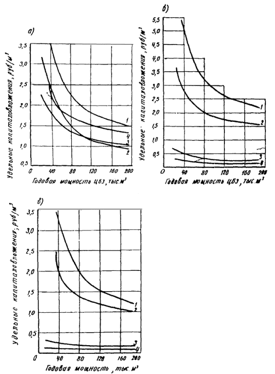 33. Капиталовложения в оборудование, строительство или передислокацию стационарных и передвижных ЦБЗ определяются из технико-экономической части типовых проектов. Эти значения должны быть скорректированы с учетом новых оптовых цен, введенных в действие с 1 января 1971 г. (постановление Госстроя СССР от 7 июня 1970 г. № 77 «Об утверждении индексов изменения сметной стоимости строительно-монтажных работ и поправочных территориальных коэффициентов»). 34. Анализ статей по единовременным затратам в оборудование, строительство или передислокацию предприятий показал, что и изменение удельных капиталовложений (рис. 4, а, б, в) в зависимости от мощности также подчинено гиперболическому закону. Установленные корреляционные зависимости удельных капиталовложений от мощности и типа ЦБЗ представлены в табл. 1. Методы расчета приведенных затрат на доставку готовых и сухих бетонных смесей35. Для оценки эффективности выбора и использования транспортных средств следует основываться на величине приведенных затрат, являющихся эксплуатационными показателями. 36. Величина приведенных затрат на перевозку материалов определяется дорожными условиями, дальностью возки, типом автомобильного транспорта и их годовым режимом работы. При составлении экономических моделей транспортных затрат на перевозку бетонной смеси следует учитывать дополнительные затраты, связанные с перевозкой малоподвижных бетонных смесей на различные расстояния. 37. Расчет приведенных эксплуатационных удельных затрат Пуд на перевозку бетонной смеси автомобильным транспортом следует вести по следующей формуле: Пуд = Суд + ЕнКуд, (8) где Суд - себестоимость транспортирования единицы продукции, руб.; Куд - удельные капиталовложения в автомобильный транспорт на единицу продукции, руб.; Ен - коэффициент экономической эффективности. Себестоимость единицы продукции определяется по формуле Суд = С + З · Кприб, (9) где С - себестоимость единицы продукции, руб.; З - заработная плата рабочим на единицу продукции, руб.; Кприб - коэффициент, характеризующий отношение стоимости прибавочного продукта к заработной плате, принимаемый равным 1,1. Подставляя значения слагаемых в формулу (9), будем иметь Пуд = С + З · Кприб + Ен · Куд. (10) 38. Себестоимость перевозки и доля заработной платы в ней могут определяться по формулам: Суд = А + Вl; (11) Зуд = С + Дl, (12) где А - затраты на эксплуатацию автотранспортных средств в расчете на 1 м3 продукции, не зависящие от расстояния ее перевозки, руб.; В - затраты на эксплуатацию автотранспортных средств в расчете на перевозку 1 м3 бетонной смеси на расстояние 1 км, руб.; С - поля заработной платы в затратах А, руб.; Д - доля заработной платы в затратах В, руб.; l - расстояние возки бетонной смеси, км. 39. Величины А, В, С и Д определяют по формулам: