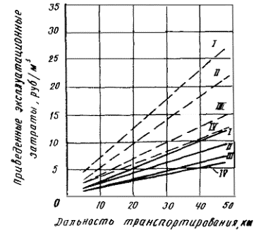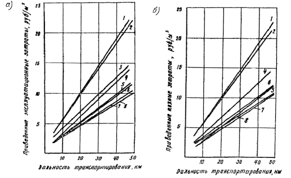 Рис. 5. Изменение приведенных эксплуатационных (а) и полных (б) затрат на транспортирование бетонной смеси в зависимости от дальности и типа транспортных средств (III категория дороги): 1 - автобетоносмеситель СБ-69; 2 - то же СБ-58; 3 - то же СБ-83; 4 - самосвал ЗИЛ-ММЗ-555; 5 - автобетоновоз емкостью 3 м3; 6 - самосвал МАЗ-503Б; 7 - автобетоновоз емкостью 5 м3; 8 - самосвал Остальные обозначения расшифрованы в формулах (13) - (16). 43. Капиталовложения на эксплуатацию автомобильного транспорта определены по общепринятым рекомендациям и представлены в табл. 2. 44. Удельный вес дорожной составляющей в себестоимости перевозок в соответствии с общепринятыми рекомендациями может быть: для дорог I категории - 5 %; для дорог II категории - 8,5 %; для дорог III и IV категории - 18 %. 45. Итоговые расчетные зависимости приведенных эксплуатационных затрат на транспортирование смесей с учетом типа автотранспортных средств и характер их изменения показаны в табл. 3 и на рис. 5, а, рис. 6. 46. Использование автомобилей-самосвалов связано с дополнительными затратами вследствие их неприспособленности для перевозки бетонных смесей, что приводит к потерям смеси в пути, снижению ее качественных показателей, вызывает необходимость применения ручного труда и т.д. Поэтому при оценке экономической эффективности использования специализированных и обычных транспортных средств необходимо учитывать особенности автомобилей и перевозимого дорожно-строительного материала. Математические зависимости приведенных затрат на транспортирование смесей и характер их изменения приведены в табл. 4 и на рис. 5, б. Рис. 6. Изменение приведенных эксплуатационных затрат от дальности транспортирования по дорогам различных категорий (I - IV):
