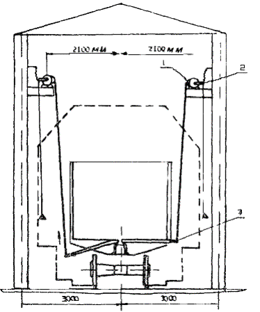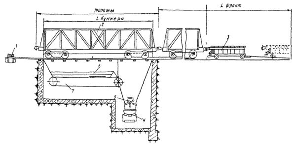 Примечания: 1. При использовании стреловых кранов-экскаваторов с грейфером емкостью 2 м3 срок выгрузки уменьшается на 10 %, емкостью 2,5 м3 - на 20 %. 2. Сроки выгрузки экскаваторным оборудованием и ковшом рассчитываются согласно методике, указанной в приложении 5 «Правил перевозок грузов». 3. Время на подготовительные и заключительные операции равно 0,1 ч - при использовании стреловых кранов и экскаваторов, 0,12 ч - на повышенных путях (на две стороны), 0,15 ч - на повышенных путях (на одну сторону). 16. Верхний предел производительности ПУ с подрельсовым бункером зависит в основном от производительности выносного конвейера, конвейера, отводящего материалы на склад, и от механизации вспомогательных операций. В некоторой степени на производительность ПУ влияет и объем бункеров. 17. Обследование показало, что производительность ПУ при выгрузке песка на 20 - 25 % меньше, чем при выгрузке щебня, но при достаточном техническом оснащении фронта разгрузки мало зависит от времени года. Производительность ПУ с подрельсовым бункером в настоящее время ограничена производительностью последнего звена в транспортной линии перемещения зернистых материалов - радиально-штабелирующего конвейера. Перемещение вагонов в зоне приемного устройства18. В зоне ПУ необходим механизм, обеспечивающий перемещение с малой скоростью нескольких вагонов, составляющих подачу, и создающий достаточное тяговое усилие при работе бурорыхлительной машины в зимнее время. Обычно для этой цепи применяют маневровую лебедку. 19. Маневровое устройство конструкции ВНИИстройдормашах) (рис. 2) позволяет перемещать вагоны в обе стороны и включает, кроме лебедки, еще и маневровую тележку, автоматически сцепляющуюся с вагоном. Поэтому целесообразно предусмотреть возможность применения этого маневрового устройства в новых ПУ. Для контроля крайних положений хода тележки и автоматизации процесса разгрузки на путях устанавливают конечные выключатели. х) Авторское свидетельство № 269972 - «Бюллетень изобретений и открытий», 1970, № 16. Открывание и закрывание люков полувагонов20. Открывание люков является первой операцией при разгрузке вагонов и отнимает до 10 чел.-мин. на один полувагон. Эта операция не механизирована и производится ударами кувалды по запорам. Для закрывания люков четырехосного вагона по нормам требуется 21 чел.-мин. Рис. 2. Схема приемного устройства с маневровой тележкой и подрельсовым бункером: 1 - направляющий блок; 2 - вагон; 3 - маневровая тележка; 4 - выносной конвейер; 5 - рыхлитель; 6 - рассекатель потока; 7 - подбункерный конвейер 21. Люки современных полувагонов подпружинены и в исправном состоянии закрываются легко, однако при неисправности требуется усилие, которое в некоторых случаях не может быть создано люкозакрывателем на базе тельфера. В связи с этим предлагается использовать люкозакрыватель с регулируемой силой тяги (рис. 3). Рис. 3. Люкоподъемник конструкции комбината ЖБИ № 6: 1 - барабан люкоподъемника; 2 - рычаг регулировки усилия подъемника; 3 - палец люкоподъемника Разгрузка, восстановление сыпучести материалов и зачистка вагонов22. Для разгрузки полувагонов ПУ необходимо оборудовать люкоподъемниками, накладными вибраторами или люковибраторами, а для разгрузки платформ наиболее эффективно применять два отвала, скрепленных над платформой, и зачищающую механическую 