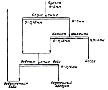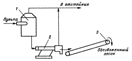 где F - площадь осаждения, м; Vст - скорость стесненного падения, см/с; Кэф - коэффициент, равный отношению эффективно используемой площади аппарата к его общей полезной площади, Кэф = 0,75; Ки, Кcr - отношение Ж:Т по массе в исходной пульпе и в сгущенном продукте соответственно; γcr - выход твердого в сгущенный продукт, %; ρ - плотность твердого, т/м3. Производительность сгустительной воронки по сливу Qсл = 36FVстКэф. Диаметр отверстия для выпуска песка определяют по формуле