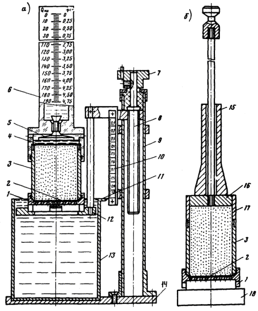 Прибор ПКФ-Союздорнии: а - фильтрационная трубка и винтовой телескопический штатив; б - приспособление для стандартного уплотнения: 1 - поддон; 2 - латунная сетка; 3 - цилиндр (d = 71 мм; h = 100 мм); 4 - сито; 5 - поплавок; 6 - мерный сосуд; 7 - штурвал; 8 - винт; 9 - направляющая колонка; 10 - скользящий кронштейн; 11 - стрелка; 12 - подставка; 13 - цилиндрический сосуд; 14 - плита; 15 - гиря массой 1,07 кг; 16 - наковальня; 17 - насадка; 18 - вкладыш В поддон 1 с латунной сеткой 2 помещают кружочек марли диаметром, равным внутреннему диаметру поддона, вставляют цилиндр 3 заостренным торцом в поддон так, чтобы заостренный торец цилиндра плотно встал на дно поддона; все взвешивают (масса m1). Затем в поддон 1 вводят вкладыш 18 и все это устанавливают на жесткое основание. На бортик цилиндра 3 надевают кольцо-насадку 17. Во избежание соскакивания кольца насадки с цилиндра (во время уплотнения песка трамбовкой) их скрепляют (снаружи) двумя полосками изоляционной ленты. Уплотняют песок до максимальной плотности в цилиндре следующим образом: перемешивают песок (после выдерживания в эксикаторе с водой), укладывают его в цилиндр слоем толщиной 0,4 высоты цилиндра, вводят в цилиндр трамбовку и уплотняют уложенный песок 25 ударами гири, поднимая гирю по направляющему стержню на высоту 30 см (до ограничителя) и затем давая гире возможность свободно падать. Уплотнив первый слой песка, рыхлят его поверхность на глубину 1 - 2 мм, затем в цилиндр укладывают вторую порцию песка слоем такой же толщины, что и первый слой, и снова уплотняют 25 ударами гири. После уплотнения второго слоя повторяют операции, указанные выше, уплотняя третий слой песка последними 25 ударами гири. Одновременно с укладкой песка в цилиндр отбирают в алюминиевые стаканчики (бюксы) пробы песка для определения его влажности по ГОСТ 5180-75. Уплотнив песок, с цилиндра снимают кольцо-насадку, а выступающую из него часть образца срезают ножом вровень с его торцом. Извлекают из поддона 1 вкладыш 18. Цилиндр с поддоном и уплотненным песком взвешивают (масса m2) и определяют массу влажного песка (m, г): m = m2 - m1. Вычисляют среднюю плотность песка (ρср, г/см3) по формуле