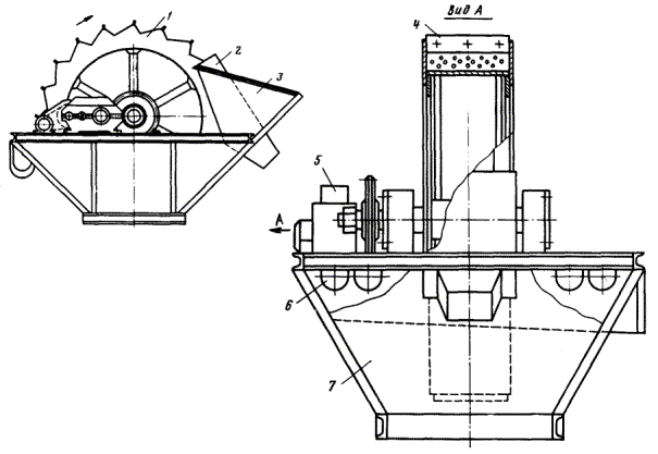 Ковшовый обезвоживатель: 1 - элеваторное колесо; 2 - разгрузочная воронка; 3 - загрузочная воронка; 4 - ковш; 5 - привод; 6 - желоба для слива воды; 7 - ванна Техническая характеристика спиральных классификаторов